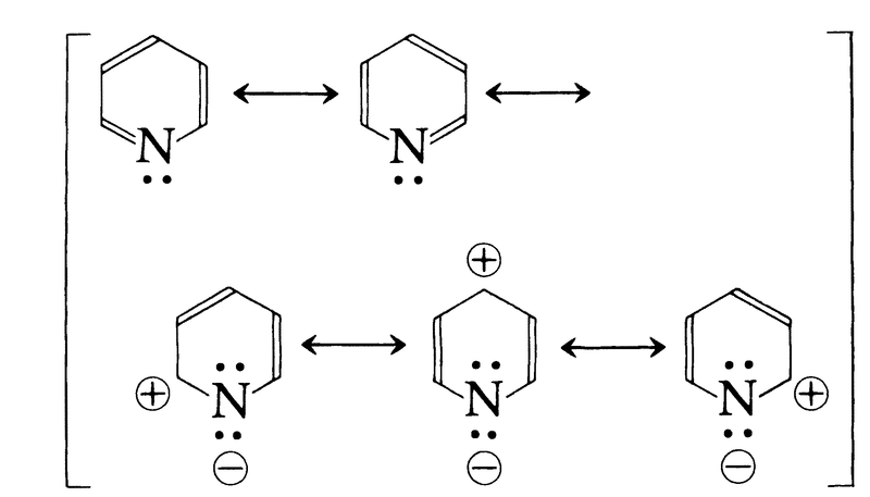 ピリジンは代表的な芳香族複素環式化合物であり,その共鳴安定化は二つのケクレ形限界構造式と三つの双極イオン形限界構造式の寄与によって説明される。