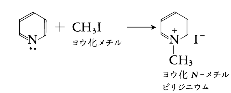 ピリジンは,窒素原子上の非共有電子対のため弱い塩基性を示し,塩をつくるので,強酸が生じる反応において除酸剤として用いられる。また第一ハロゲン化アルキルとの反応によってN-アルキルピリジニウム塩を生じる。