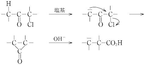 塩基の作用でα-ハロケトンのアルキル基が転位してカルボン酸になる反応.
