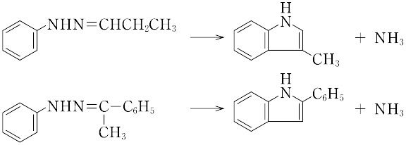 アルデヒドやケトンのフェニルヒドラゾンに,BF3,ZnCl2,ポリリン酸などの酸を加えて加熱すると,インドール誘導体を生成する反応.たとえば,プロピオンアルデヒドフェニルヒドラゾンから3-メチルインドールを生じ,アセトフェノンフェニルヒドラゾンから2-フェニルインドールを生じる.