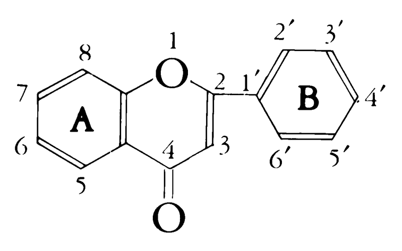 2-フェニルクロモンともいう。各種の下等・高等植物に広く分布する環状の有機化合物で,サクラソウ科植物プリムラなどの葉の裏や果実の表面の白い粉末もこの化合物を含む。融点99~100℃の無色針状結晶。水にほとんど溶けず,濃硫酸溶液は蛍光を発する。アルコール,ベンゼンには易溶。狭義には置換基のないフラボンそのものを指すが,広義ではフラボンの骨格に水酸(ヒドロキシル)基やメトキシル基が結合した化合物をフラボン類に含める。水酸基が5位と7位に存在するものをアピゲニン,さらに3′位にも存在するものをルテオリンと呼ぶ。水酸基の数が増すと黄色が深くなる。無色のものから橙色のものまで知られている。植物から得られるものの大部分が配糖体であるが,フラボンは他のフラボノイドと違ってC-グルコシドとなることが多い。フラボンの3位に水酸基をもつ化合物をフラボノールと呼ぶが,この水酸基もたいていの場合,配糖体となっている。ケンフェロール,ケルセチン,ミリセチン,アントシアニジンなどがよく知られた代表的化合物である。またフラボンはアセトンとベンズアルデヒドからも合成される。