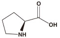 Hをもつ環状のアミノ酸(イミノ酸)の一つで分子量115.13。ピロリジン-2-カルボン酸構造をもつ。1901年にドイツの有機化学者フィッシャー(1902年ノーベル化学賞受賞)がカゼインの加水分解物から初めて分離し、プロリンと命名したが、DL-プロリンはその前年にドイツの有機化学者ウィルシュテッターによって合成されていた。L-プロリンはほとんどのタンパク質に含まれるが、とくにコラーゲンとその変性物であるゼラチンに多く、構成アミノ酸(タンパク質をつくっているアミノ酸のこと)の20%前後を占める。エタノール(エチルアルコール)に溶ける唯一のアミノ酸で、水に対する溶解度はタンパク質をつくるアミノ酸のうち最大である。弱い甘味があり、ニンヒドリンで黄色に、イサチンで青色に呈色する。亜硝酸と反応してニトロソ化合物をつくり、窒素を発生しない。非必須(ひひっす)アミノ酸で、生体内ではグルタミン酸からつくられる。植物中ではピロリンを経てアルカロイドのアトロピンやニコチンになる。なお、コラーゲン中には3位または4位の水素がヒドロキシ基に置換されたヒドロキシプロリンが10%程度含まれている。4-ヒドロキシプロリンも1902年フィッシャーがゼラチンの加水分解物からプロリンとともに単離した。水酸化はプロコラーゲン‐プロリン‐ジオキシゲナーゼによる。この反応には鉄イオンFe(2+)とアスコルビン酸(ビタミンC)が必要である。壊血病はコラーゲン生合成においてプロリンとリジンの水酸化(ヒドロキシ化)ができなくなり、正常なコラーゲンができなくなることに起因する。