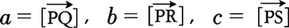 が共平面であるとは,P,Q,R,Sが同一平面上にあることである。共線のときと同様に,全部は0でない実数α,β,γがあって,αa+βb+γc=0となることと同値である。共平面でないベクトルa,b,cは一次独立であるという。a,b,cが一次独立であることと,[αa+βb+γc=0⇒α=β=γ=0]は同値である。例えば,座標単位ベクトルi,j,kは一次独立である。一次独立なベクトルa,b,cが与えられれば,かってなベクトルはαa+βb+γcと書ける。