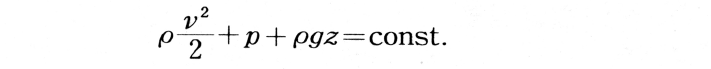 これをベルヌーイの式(Bernoulli’s equation)という。左辺の第1項は単位質量のもつ速度のエネルギー,第2項は圧力のエネルギー,第3項は位置のエネルギーで,これら3種のエネルギーの和は一つの流線に沿って一定であることを示している。