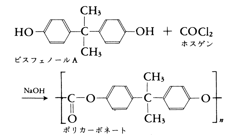 ビスフェノールとホスゲンの反応では塩化水素が脱離するので,その捕集剤を共存させる必要があり,アルカリ水溶液系やピリジン系で行う方法がある.工業的には前者が採用されているようである.機械的性質,耐候性,耐熱性がすぐれ,寸法安定性がよく,難燃性,透明であるが,わずかながら吸湿性がある.メタノール,ケトン,エーテル,芳香族炭化水素などの有機溶剤に対する耐溶剤性はあまりよくない.また,ジクロロメタン,ジオキサン,クロロベンゼンなどが好溶媒である.寸法安定性のよい点を利用して,機械部品,電気部品,写真フィルムベース,光記録材料(CD)などに利用できる.[CAS 24936-68-3]