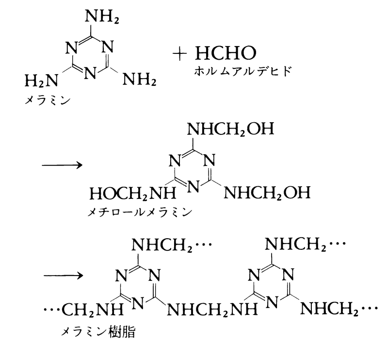 メラミンはアミノ基を3個、したがってホルムアルデヒドと反応する官能基を6個もっている。配合比と反応条件によって多くのメチロール基HOCH2-または(CH2OCH2)nOH-の入ったポリメチロールメラミンの混合物になる。これが初期反応物である。一般的な製造法は、メラミン1モルとホルムアルデヒド3.3モルを混合し、炭酸ナトリウムまたはアンモニアを用いて弱アルカリ性で80℃ぐらいで反応させる。水溶液がシロップ状になる。このシロップを水‐アルコールに溶解しパルプなどの充填(じゅうてん)剤に混合したのち、乾燥し粉砕して微粒にする。同時に着色材料、離型剤を加えて、加圧・加熱して成形物をつくる。