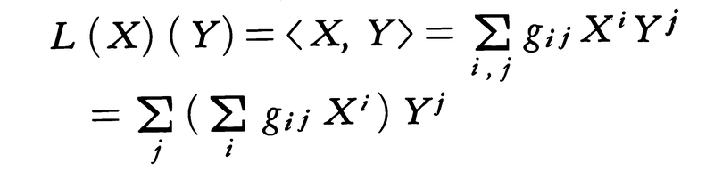 を,上に添字をもつベクトルX=(Xi)から,下に添字をもつベクトル(Xj),Xj=ΣgijXiへの移行と読みかえる操作を拡大したものにほかならない。(gij)の逆行列(gij)によってこの逆の操作も可能であり,したがって一般にテンソル(Rabc),……に対しても(gij),(gkl)を適当に乗じて和をとれば,