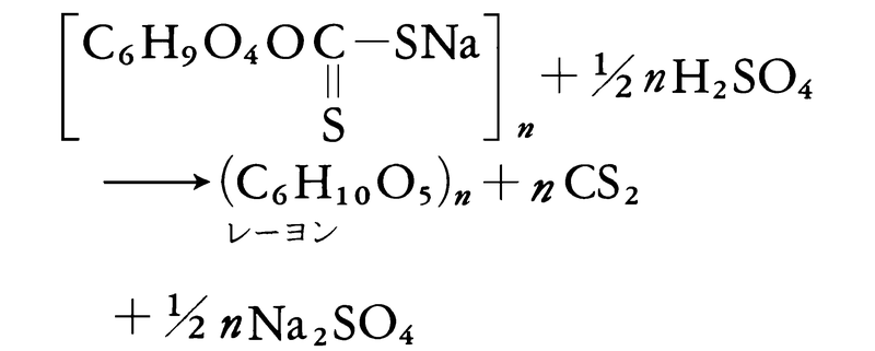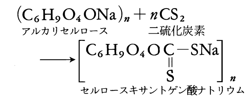 ビスコースレーヨンは、パルプをアルカリで処理してアルカリセルロースとし、二硫化炭素を作用させることによってセルロースキサントゲン酸ナトリウムを得る。これはアルカリ液に可溶である。この溶液をビスコースという。この溶液を硫酸浴中へ紡糸口金(ノズル)より圧出すると、ビスコースは凝固し、キサントゲン酸ナトリウムが分解してセルロースが糸状に再生される。この再生糸をレーヨンとよぶ。T‐ダイを使って膜状に酸浴中に圧出するとセルロースフィルム(セロファン)が再生される。