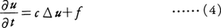 によって記述される。ここでcは熱伝導率などによって定まる正の定数であり,fは外部から熱が供給される状態を表す既知関数である。(4)の形の方程式は放物型方程式,または熱伝導方程式と呼ばれる。また物質の拡散現象においても,その物質の濃度uの変化は(4)の形の方程式で記述されるので,この方程式を拡散方程式とも呼ぶ。