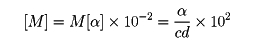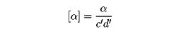 ここでc'は試料中の光学活性体の濃度(純物質であれば密度)、d'は透過層の厚さであり、それぞれg cm-3, dmを単位とし、[α]の単位は10-1 deg cm2 g-1となる。溶液の場合、これは溶質1gを含む溶液1cm3の1dmの厚さの液相を偏光が通過したときの旋光角に相当するが、現実の試料では溶解度が高すぎるため、溶液100cm3での値(数値は実測値の100倍となる)も用いられる。モル旋光度