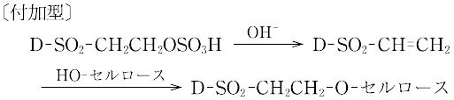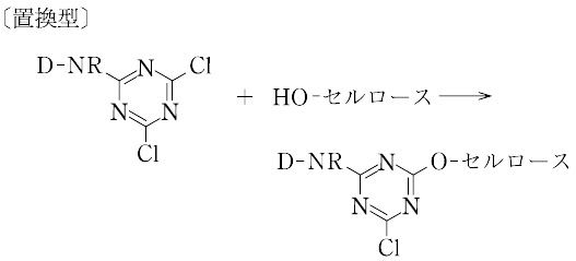 反応性染料ともいう.繊維と共有結合を形成して染着する染料.したがって,染料分子は繊維中の官能基と反応して共有結合を生成する活性基をもつことが必要である.それら活性基に対して繊維の官能基,たとえば,ヒドロキシ基(セルロース),アミノ基,カルボン酸アミド基,あるいはメルカプト基(羊毛,絹,ナイロンなど)が次のように親核的に置換あるいは付加反応して染着するものと考えられる(Dは染料の母体).