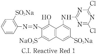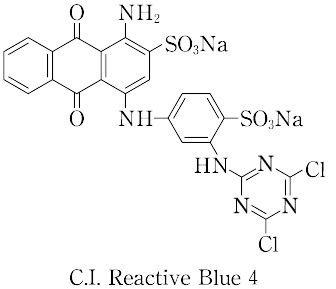 なお,この原理を拡張して染料と繊維の両方と反応する架橋剤を用いる方法も開発されている(Basazol染料).染料母体はアゾ染料,アントラキノン染料およびフタロシアニン染料が多く用いられている.反応染料の特色は,繊維との共有結合の結果として諸堅ろう度中,とくに湿潤,昇華,摩擦などにすぐれ,また色相が豊富で鮮明なことである.さらに染色法が簡易でなせんなどによる連続染色性において他種染料の追随を許さず,今後,その重要性はますます増大するものと思われる.例を図示する.