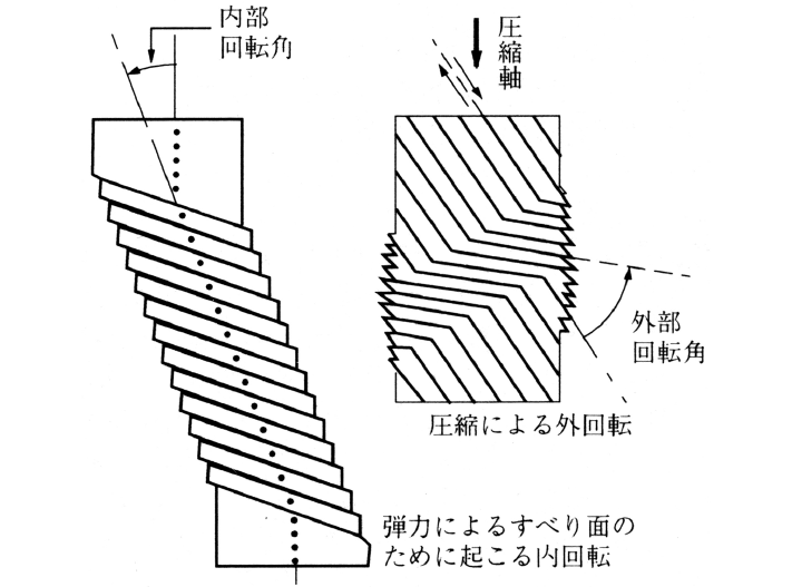地学的現象においては,内回転と外回転を区別。内回転は,物体内部に固定した座標系に関して,物体の変形によって起こる回転である。アフィン変形において,変形前の直線は変形後も直線であるが,その方向は変形によって一般に変化し,回転が起こる。ただし特別の場合にのみ,歪み主軸の回転が起こらない。この場合を非回転歪みといい,純粋すべりはその代表的な場合。圧延がほぼこれに相当。この場合にも主軸以外の方向では回転が起こっている。内回転に対し,物体内部に固定した座標軸が物体外の空間に固定した座標系に関して回転することを外回転という。例えば,両端固定した試料を軸方向から圧縮したときの歪み(キンクバンドなど)や,フレキシュラル・スリップ褶曲の場合の層面の褶曲で示される回転は外回転。後者の場合,地層内部において層面に固定した座標系に関する歪みによる回転が内回転。変形現象では外回転と内回転とが同時に起こり,外的制約のもとで互いに補い合っている。すなわち,同時に起こる外回転と内回転とのセンスは逆である。地学的現象においては,外回転のみならず内回転も不確定の場合が多い。その場合には,歪みの成分のうち純粋歪みしかわからない。
