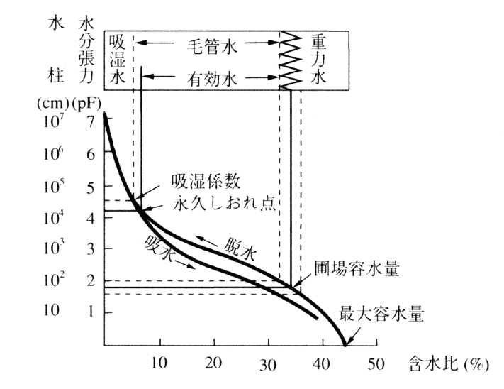 土壌の孔隙中に存在する水。105℃で土壌を乾燥,その減少重量から土壌水分量を求める。土壌中の水は,マトリックポテンシャル(土壌による水分子の引きつけ),浸透ポテンシャル(溶質による水分子の拘束),重力ポテンシャル(土壌水の基準面からの位置のエネルギー)の3種類のポテンシャルをもつため,土壌による水の保持は3種類のポテンシャルによって決まり,圧力単位(パスカル(Pa),バール(bar),気圧(atm),水柱の高さ(cm),水柱高さの常用対数(pF))で表す。重力によって下降する水(重力水)は土壌によって引きつけられておらず,重力ポテンシャル・浸透ポテンシャルによって支配される。毛管力によって保持されている水(毛管水)や土壌表面に皮膜状に保持されている水(吸湿水)はマトリックポテンシャル・浸透ポテンシャル・重力ポテンシャルによって支配されている。土壌中に存在する水のうちpF1.5~4.2の植物が利用できる水を有効水,さらにpF1.5または1.8~3.0の水を生長有効水という。