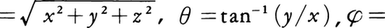θ=tan⁻1(y/x)という座標変換式が成り立つ。同様に,空間の直交座標(x,y,z)と極座標(r,θ,φ)の間に,x=rsinφcosθ,y=rsinφsinθ,z=rcosφ,または逆に,r