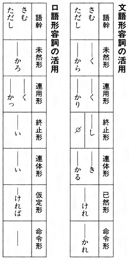 文語の「正し」は終止形では表面上語尾を欠いている。これは本来ならば「正しし」となるところであるが、「し」が重なるので重音脱落haplologyの現象をおこして、「正し」となったものと考えられる。一般の学校文法などでは、語幹を「ただ」とし、「し」を語尾に回して「しく」「しから」「しく」「しかり」「し」「しき」「しかる」「しけれ」「しかれ」とし、結果として、「寒く」などの「ク活用」と、「正しく」などの「シク活用」の2種類の活用を認めることになっている。これはいつに終止形でゼロ語尾になることを避けたためであるが、体系的に考えるならのようにゼロ語尾を認めるほうがよい。英語のsheepなどの複数形にゼロ語尾を認めるのと同じ考え方である。口語、文語を通じて、語幹末に「し」をもつ形容詞には「うれしい」「たのしい」「かなしい」「こいしい」「なつかしい」「さびしい」「うらめしい」「うらやましい」「おそろしい」「うとましい」などの情緒を表す語が比較的に多い。「うつくしい」は、現在は客観的状態を表すが、奈良時代には親が子を慈しむ感情を表していたものである。