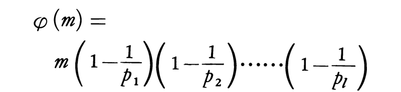 で表す。例えば,3≡10 (mod 7)である。整数mに対し,aとbがmを法として合同であるとき同じ組に属するとして,整数全体をm個の組に分けることができる。その組をmを法とする剰余類という。剰余類の中で,法mと互いに素な整数からなる類を既約剰余類という。法mの既約剰余類の個数をφ(m)で表し,φをオイラーの関数という。ただし,φ(1)=1と定める。互いに素な正の整数m,nに対し,φは,