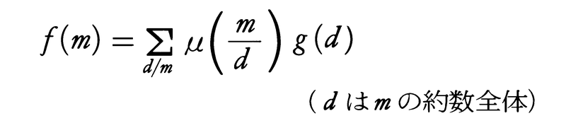 で定められるgも整数論的関数である。fが乗法的ならば,gも乗法的である。逆に次のように定めるメービウスの関数μを用いると,gを用いてfを表すことができる。すなわちμを,(1)μ(1)=1,(2)mがある素数の平方で割り切れるときはμ(m)=0,(3)m=p1・p2・……・pk(p1,……,pkは相異なる素数)のときはμ(m)=(-1)kと定める。μは乗法的な整数論的関数で,mが1でなければ,