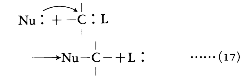 求核試薬Nu:が正電荷を帯びた基質炭素原子を攻撃し,結合している原子または基と置換する反応を求核置換nucleophilic substitution反応という。追い出される原子または基を脱離基leaving group(L:と略記)という。脱離基は結合電子対とともに炭素から離れる一方,求核試薬が新しい電子対をつくる電子を供給する。
