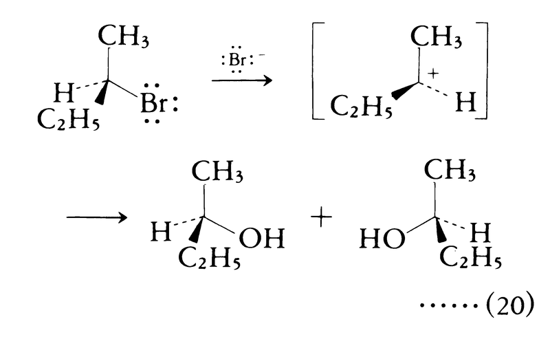立体障害を受けている臭化第三ブチルのような化合物は,五配位遷移状態を経由しない別の反応経路をとる。この経路の反応速度は1次反応速度式に従う。また光学活性物質はラセミ化される。ヒューズおよびインゴルドの図式によるとこの反応経路は一分子求核置換unimolecular nucleophilic substitution(SN1と略記)であり,律速段階は三配位平面構造をもつ反応中間体カルボカチオンの生成である。