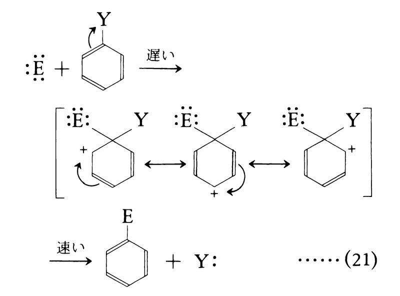反応中間体は共鳴によって安定化される。置換基をもつベンゼン環に対する求電子置換は,新たに導入されるEがすでに環に存在する置換基とどのような位置関係になるかという配向orientationの問題と,ベンゼンに比べて反応性は高いか否か,という反応性の問題がある。これらはいわゆる置換基効果substituent effectとして知られている。