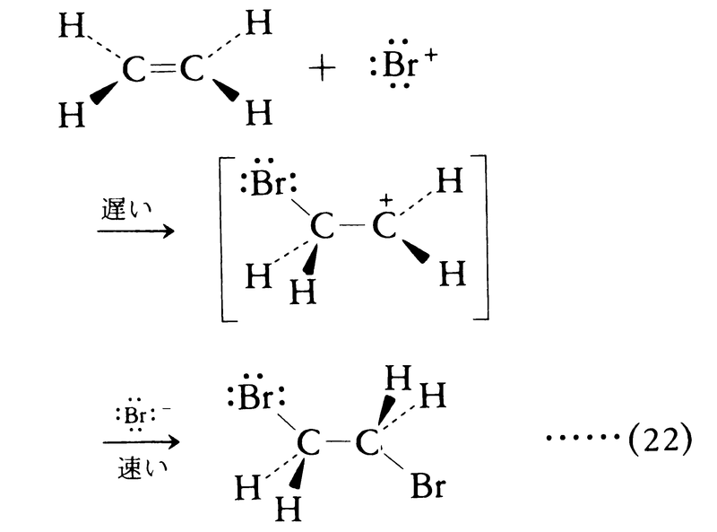 の付加が起こる。エチレンと臭素との反応では,まず求電子試薬ブロモニウムイオン