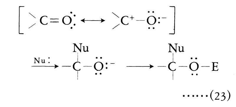 C=Oに対する付加は正電荷を帯びた炭素原子に対する求核試薬の攻撃が反応の原動力となる。多くの場合,この段階に続いて求電子試薬が酸素原子と結合する。