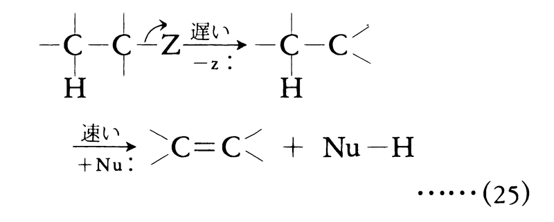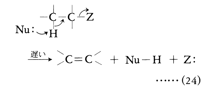 置換反応や付加反応と同様,脱離反応も種々の機構で起こりうる。典型的な脱離反応は求核置換と競争的に進む求核脱離である。求核試薬(多くの場合アルコキシドイオンや水酸化物イオン)が電気陰性基(脱離基でもある)によって活性化された水素を攻撃し,基質からプロトンとして引き抜く段階が反応の原動力である。プロトン引抜きと脱離基の脱離が同時に進行するのが二分子求核脱離(式(24)),脱離基の脱離が先行し,カルボカチオンが中間生成するのが一分子求核脱離(式(25))である。