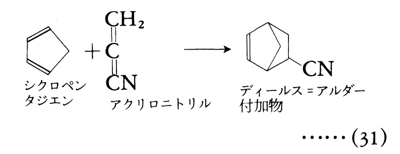 イオン反応,ラジカル反応のどちらにも属さない,特徴的なペリ環状反応pericyclic reaction(電子環状反応ともいう)と呼ばれる反応の一群がある。この反応では反応物の分子軌道どうしが相互作用して閉じたループをつくり,このループの中で電子対が再配列して結合の切断,生成が起こる。結合の開裂・生成は段階的でなく同時に起こる協奏反応であることが,ある反応がペリ環状反応であるための必要条件である。ペリ環状反応の最も一般的な例は,2種の不飽和化合物による環形成反応,いわゆる付加環化cycloadditionである。とくにジエンとアルケンとの反応によるシクロヘキセン環生成反応であるディールス=アルダー反応(ジエン合成)は名高い。