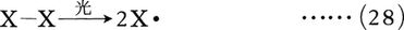 このような反応の経過を連鎖反応chain reactionという。多くの場合,式(27)とは別の機構で最初のX・が生じる。ハロゲン分子X2の光開裂によるX・の生成はその一つである。