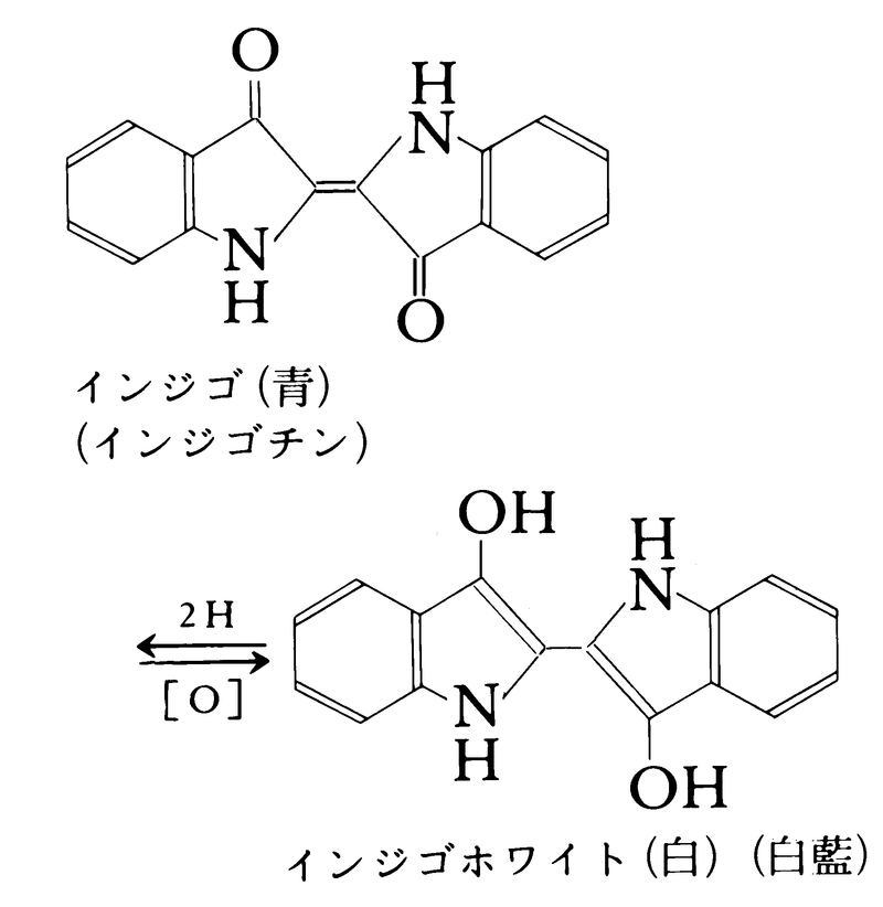 これが空気酸化されて生成するインジゴをさらに発酵により還元させインジゴホワイト(白藍)とし,染色後,空気酸化して青い染色物を得るが,このような複雑な化学反応を含む技術を古代より人類がもっていたことは驚くべきことである。合成染料の誕生は1856年にイギリスの化学者W.H.パーキンがアニリンの酸化により赤紫色色素を発見し,モーブmauveと名づけて57年より工業化したことに始まる。