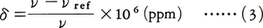 核が一定の静磁場B0の中に置かれたとき,式(1)によれば核の種類が同じであれば共鳴周波数νも同じはずである。しかし核のまわりの電子によって磁場から遮へいされるため,核が実際に感じる磁場はB0そのものではなく,それよりごくわずか小さい磁場Bである。この差B0-Bを化学シフトchemical shiftという。NMRの有用性は,まさにこの化学シフトの存在にある。化学シフトは,その核の置かれた化学的・磁気的環境によって決まる。このため,原則として化学的に異なる環境にある核は異なる磁場を感じている。したがってNMRを起こさせる共鳴周波数は核により異なる。実際エチルアルコールCH3CH2OHのプロトンNMRのスペクトルには,3種のプロトンに対応した3本のシグナルが記録される(図2)。化学シフトを標準化するため,測定試料には基準物質としてテトラメチルシラン(TMS)を少量加える。問題のプロトンシグナルの共鳴周波数νとTMSの共鳴周波数νref の差⊿νは発振器の周波数の106分の1程度である。そこで,この比に106を乗じたものを化学シフトδと定義する。定義によりTMSはδ=0にシグナルをもつ。