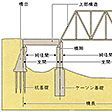 橋の構造は,いわゆる橋桁と総称される上部構造と,これを支えて地盤に力を伝える下部構造とに大別される(図1-a)。下部構造のうち地上にある軀体(くたい)は,さらに橋台と橋脚に分けられる。橋台は橋の両端にあって岸に接しているコンクリート構造物で,橋桁からの力のほか,岸からの土圧を受ける働きをする。橋脚は橋台の中間にあって橋桁を支える構造物で,やはりコンクリート造が多いが,背の高い場合とか都市内の高架橋では鋼製橋脚が用いられることがある。橋台,橋脚はさらに地中にある基礎に支持されている。基礎は一般に堅固な支持地盤に達するまで埋め込まれ,浅い場合には鉄筋コンクリート版の直接基礎,深い場合には杭基礎か,鉄筋コンクリートまたは鋼製の箱の中にコンクリートを充てんしたケーソン基礎が用いられる。土層が非常に厚いときは杭と土の摩擦で杭の支持力を確保しなければならないことがある。