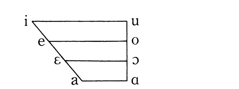 (1)舌の形は,(a)舌の位置が口蓋に最も近いものを高母音high,遠いものを低母音lowとし,その中間を中母音midとする。また,(b)舌の最高点が唇の方へ寄っているものを前舌母音front,奥へ引っ込んでいるものを後舌母音backとし,その中間を中舌母音centralという。