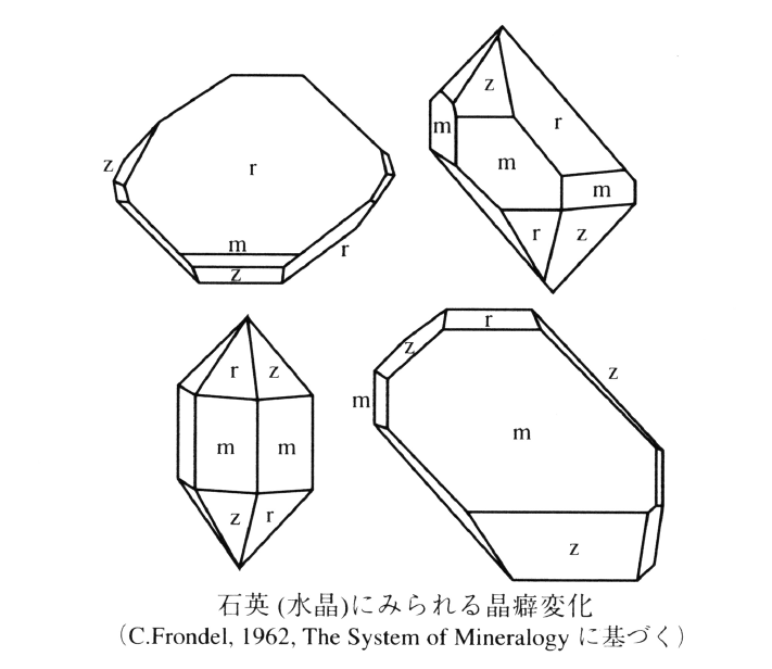 鉱物が自由な空間において結晶した場合は,本来その鉱物の示す規則正しい対称性をもつ凸多面体の結晶形態を示し,この場合を〈自形〉を示すという。岩石の空隙(晶洞)中に熱水より生じた水晶の結晶はその例である。これに対し,岩石を構成する鉱物の多く,例えば花コウ岩中の石英などは,他の鉱物の間をみたして結晶し,〈他形〉を示している。…