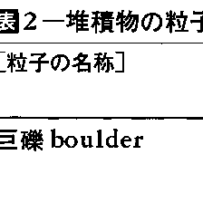 (1)粒度組成による分類 堆積物を構成する個々の粒子は,ほぼ球体と仮定して,その粒子の大きさ(粒径)によって礫,砂,シルト,粘土などに分類される(表2)。天然に産する堆積物はいろいろの大きさの粒子がいろいろの割合で混合したものであるため,この粒度組成の統計的特徴によって堆積物は分類される。最も簡便なのは,1954年シェパードFrancis Parker Shepardの提唱した〈砂・シルト・粘土〉三角ダイヤグラム(図1)である。