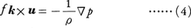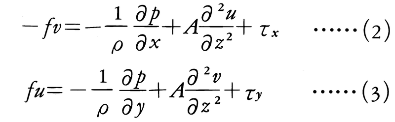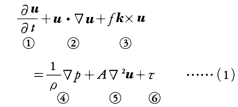 ここでuは流速の東向きおよび北向きの成分を持つ二次元のベクトル(u,v)である。fはコリオリパラメーター(=2Ωsinφ。Ωは地球の自転率,φは緯度),kは単位ベクトル,pは圧力,Aは粘性係数,τは風の東向きと北向きの応力を表すベクトル(τx,τy)である。(1)式で,(1)項は局所時間変化を表し,(2)項は移流項(対流項または非線型項ともいう)と呼ばれる。(3)項はコリオリの力を表し,(4)項が圧力傾度力,(5)項が粘性力である。エクマンが最初に考えたのは無限に続く海の上を一方向に風が吹いたときの定常解で,そのときx(東)方向とy(北)方向の方程式(1)式から,