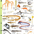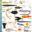 浅海域海底の緩やかに傾斜した大陸棚は、およそ200メートルの深さから急に落ち込み、約3000メートルの深さで、より平坦(へいたん)な深海底に移行するが、この深さ200~3000メートルまでの海域を漸深海帯とよんでいる。この海域でみられる動物は、その種類も比較的豊富で、系統的には原始的な動物群を多く含んでいる。魚類では、漸深海帯のやや上部に、ハダカイワシ類、ヨコエソ類、ムネエソ類など、銀白色ないし暗灰色のものが数多くみられる。一方、漸深海帯の下部になると、オオクチエソ類、フクロウナギ類、フウセンウナギ類、それにチョウチンアンコウ類など、体は主として黒色ないし暗紫色で、珍奇な形態のものが目だつようになる。また、漸深海帯でみられるこれらの魚類の多くが発光器をもっていることも大きな特徴の一つである。魚類以外では、胃腔(いこう)中に雌雄1対の小エビが共生していることで有名なカイロウドウケツなどの六放海綿類や、1864年に発見されるまでは化石でしか知られていなかった有柄(ゆうへい)ウミユリ類、それに浅海域ではみられないような大形ウミグモ類などが知られている。このほか、日本近海では、巨大なタカアシガニ、原始的な巻き貝のオキナエビス、それに水産資源として重要視されているサクラエビや大形巻き貝のカガバイ(エッチュウバイ)が有名である。なお、漸深海帯では、魚類以外でも、イカやエビの類に発光器をもつものが知られている。また、甲殻類に赤い色素をもったものが多いのもこの海域の特徴の一つである。