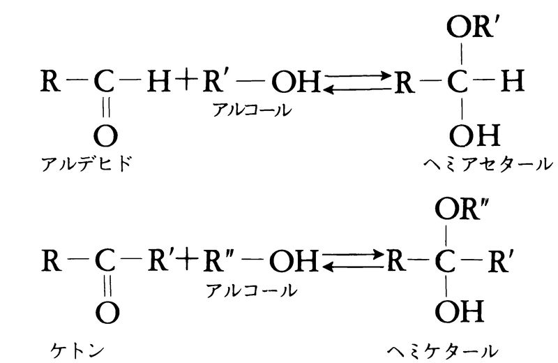 α,βの説明のためには糖の環状構造に立ち入らなければならない。単糖のアルデヒド基,ケトン基は,通常分子内でヘミアセタールhemiacetal,またはヘミケタールhemiketalを形成している。