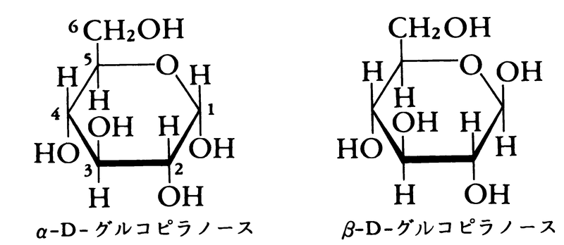 ピラノース環を平面に見立てると,この面から6位の炭素と逆の方向に,すなわち上の図では下向きに水酸基が配置されているのがα体であり,上向きに配置されているのがβ体である。αとβの違いは糖鎖の立体構造に大きな影響を与える。たとえばα1→4結合のデンプンでは,グルコースはらせん状に巻かれるが,β1→4結合のセルロースでは,グルコース鎖は直鎖状にのびている。