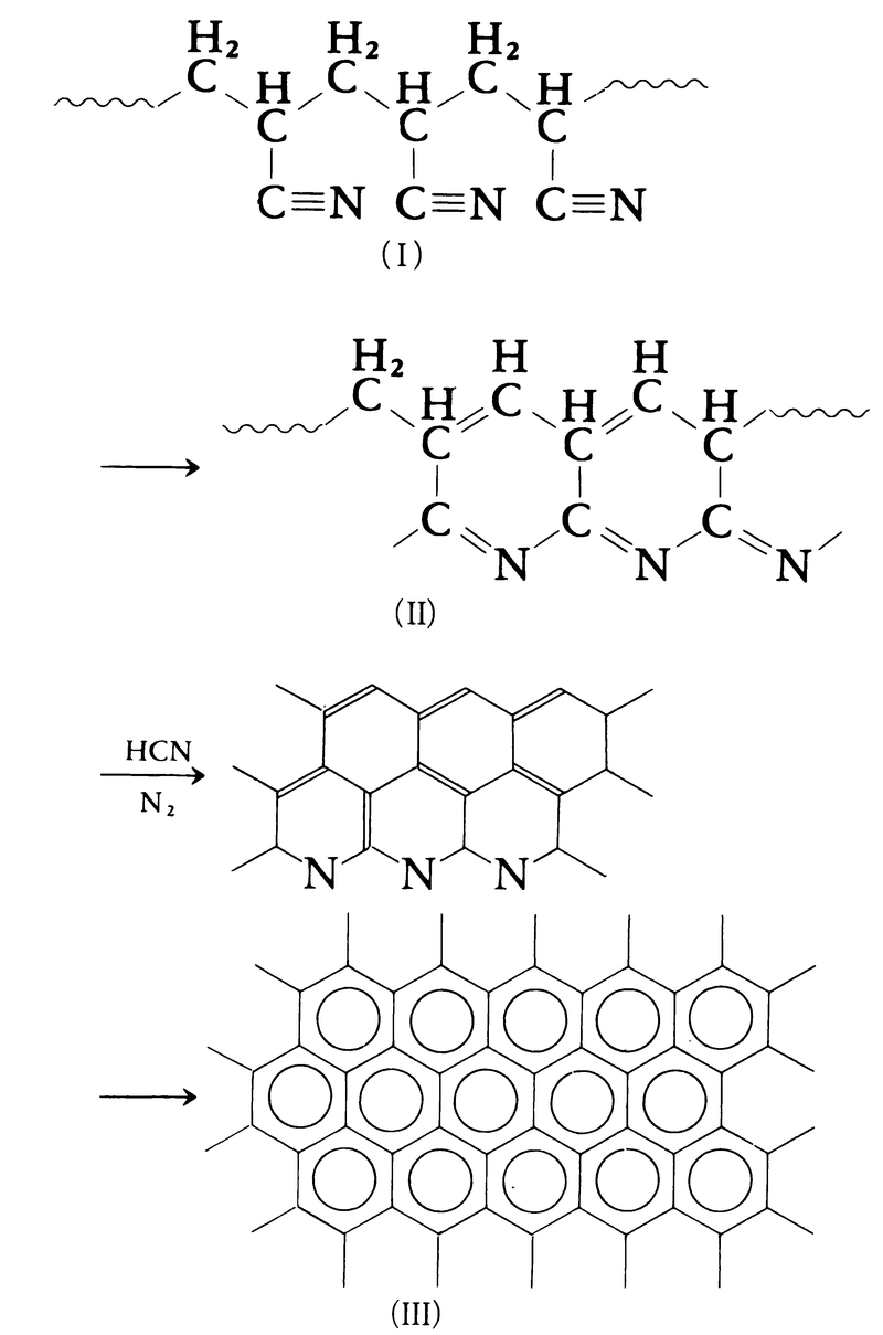 この炭素繊維を樹脂で固めた複合材料はゴルフクラブのシャフト,テニスラケット,釣りざおなど構造材料に多く使用される。最近は航空機の分野にも本格的に使われるようになった。高弾性率高伸度炭素繊維は,強度2.5~5.0GPa,弾性率200~300GPaという高い値をもつ。製法は,ポリアクリロニトリルからできているアクリル繊維(Ⅰ)を加熱して縮合ピリジン環(Ⅱ)を主成分とするポリマーに変え,さらに1500℃くらいの高温での炭素化工程でシアン化水素HCNや窒素N2を放出させて,炭素の基本構造である縮合多環芳香族構造(Ⅲ)を形成させる。