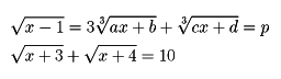 のように無理式を含む方程式を無理方程式という。無理方程式を解くには,両辺を何乗かして式を整理し,さらに同様の操作をいくどか繰り返して代数方程式を得,この代数方程式の根のうちで最初の無理方程式を満足するものを求めればよい。最初の無理方程式を満足しない根を無縁根という。上記の無理方程式,