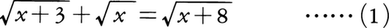 として、両辺を平方して移項すると、二次方程式x2-11x+28=0が得られる。これを解いて解4と7を得る。そこでこれらの解を与えられた方程式のxに代入すると、4は方程式を成り立たせるが、7は方程式の左辺の値を9にするので、成り立たない。したがって4が解となり、7は無縁根である。方程式