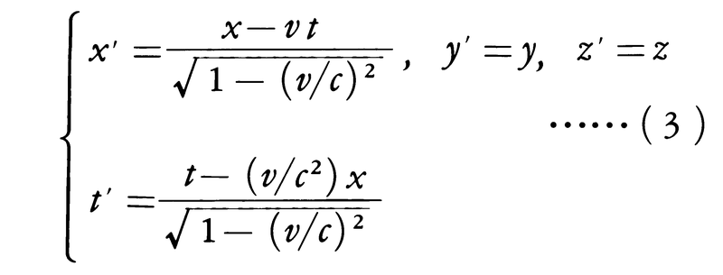 この変換式が示すもっとも著しい特徴は,空間と時間(xとt)とが互いに移り変わることである。以前の考え方では,時間はあらゆる座標系に共通な流れであり,どんな座標変換を行っても絶対不変に保たれるものと考えられていた。すなわちt′=tであると,暗黙のうちに仮定されていたのである。このあまりにも明白とされてきた常識を打破することが,光速にまつわるなぞを完全に解き明かす鍵であった。