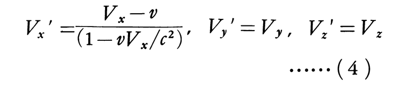 ローレンツ変換(3)からは,さまざまの新しい結果が導かれるが,速度の合成則も(2)式ではなく,