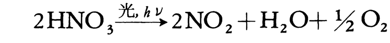 濃硝酸はしばしば光化学反応によってNO2を生じ黄褐色になっている。