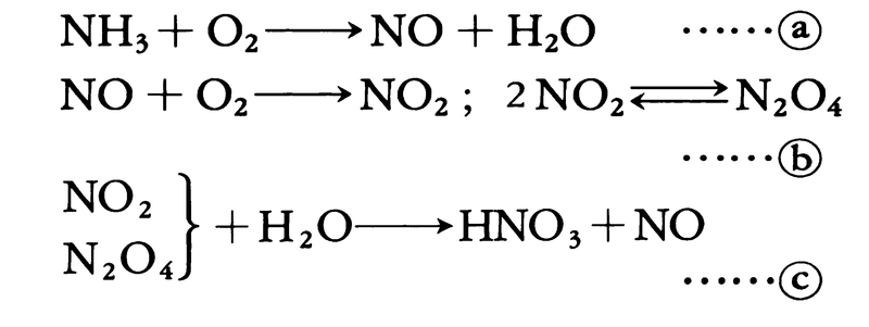 (a)では700~900℃に保持した白金網触媒上にアンモニアガスを通して空気または酸素により短時間の接触的酸化(10⁻4秒程度)を行わせる。95~98%の酸化収率である。生成高温NOガスを冷却すると(b)が進行する。低温では一部が会合して四酸化二窒素N2O4となる。これらから(c)により硝酸を得るが,この際一酸化窒素NOが発生するので,再び(b)の循環を行う。以上の工程で60~65%(重量)の希硝酸が得られる。酸化・吸収の各工程を常圧にするか加圧(3~9気圧程度)にするかで,いくつかの方式に分けられる。