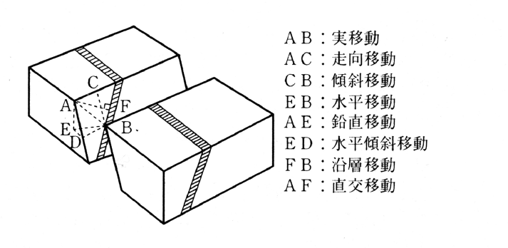 …断層面と水平面の交線の方向を断層の走向といい,断層面と水平面のなす角度を断層の傾斜という。また断層面に沿って両側が移動した距離を変位量または移動という。断層面をはさんで隣りあっていた2点間の断層運動後の距離を実移動といい,実移動の走向方向の成分を走向移動,傾斜方向の成分を傾斜移動という。…