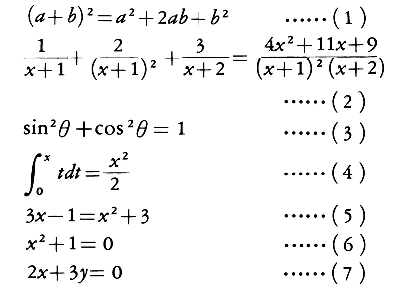 はすべて等式であり、第二の例はa、bがどんな数値を表すときでもつねに成り立つから、恒等式であり、第三の例はxが特定の数値(-1と5)を表すときだけ成り立つから、方程式である。また第四の例は左辺と右辺の三角形の面積が等しいことを表す。