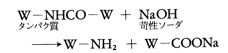 (6)化学的性質 羊毛はタンパク質繊維である。タンパク質繊維は約20種のα-アミノ酸を構成成分とする天然高分子で,化学合成はできない。ケラチンと呼ばれる種々のタンパク質の混合物から成る。羊毛は濃アルカリや熱い希アルカリに侵されるが,それは,次のようにアミノ酸を互いに結合させているペプチド結合-CONH-がアルカリで加水分解されるからである。